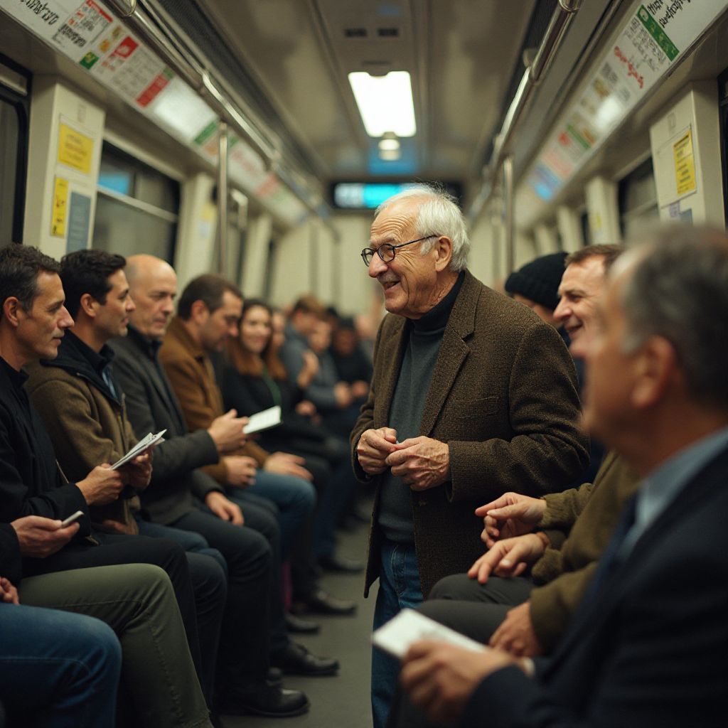 В углу вагона, рядом с плохо освещённым окном, стоял пожилой мужчина. Его высокий, но согнутый под тяжестью лет силуэт в поношенном коричневом пальто с выбелевшими пятнами сразу выделялся на фоне блестящих кожаных курток молодых пассажиров. Лицо было изрезано глубокими морщинами, а глаза — ясные, несмотря на усталость, — казалось, стреляли в пространство сквозь людей вокруг. Его седые волосы выглядели растрёпанными, а руки дрожали не от холода, а от живой, но скрытой боли. Он держал в руках потрёпанную маленькую книгу песенников, победно обняв её, как последний мост к прошлому.