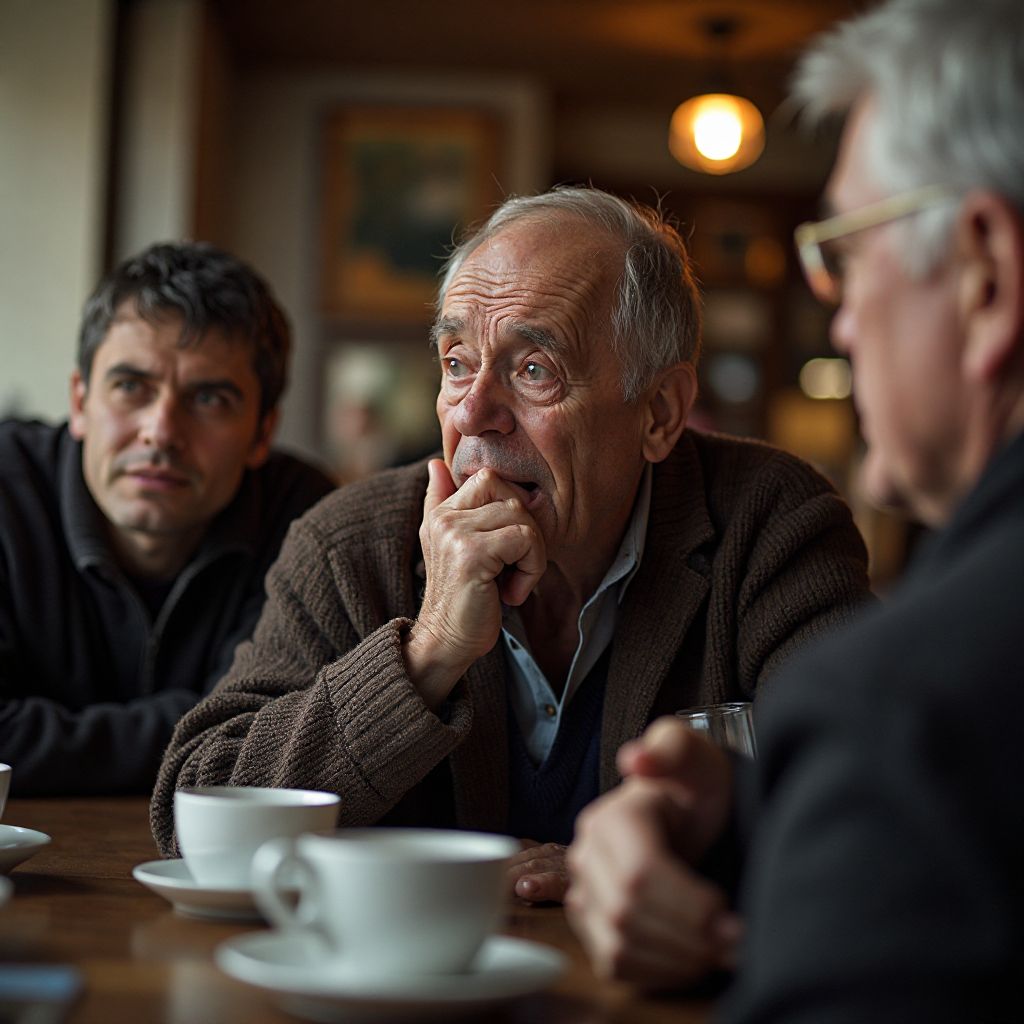 Ветер снаружи усилился, капли дождя ударили по стеклам, а в самом кафе — тишина, наполненная ожиданием. «Если я сейчас не скажу… никто не узнает…», — пробормотал старик, заглядывая в глаза удивлённым посетителям. Сердце бешено колотилось, а губы дрожали от волнения и страха. Все присутствующие словно замерли во времени, и атмосфера накалилась до предела.