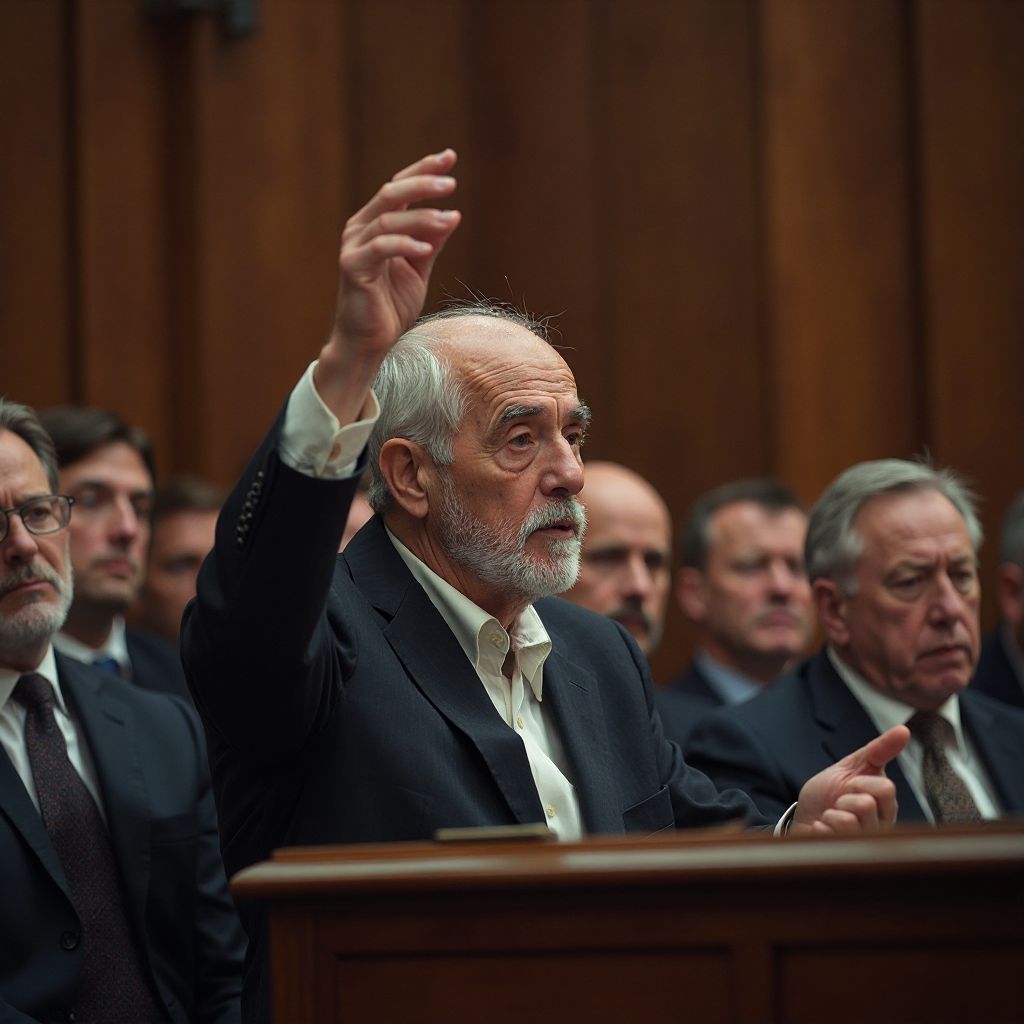 — «Вы не имеете права так поступать!» — громким, но дрожащим голосом воскликнул старик, поднимая руку. Его голос резал тишину, заставляя всех повернуть головы, как будто в зале судьи и обвиняемые на мгновение замерли во времени.