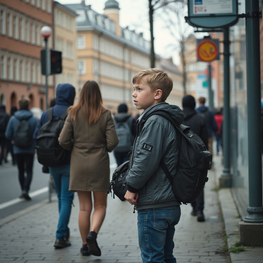 В голове мальчика крутились тревожные мысли. Почему мама так задержалась? Он повторял себе, что всё скоро будет хорошо, что автобус приедет, и он поедет домой. Но вокруг всё казалось чужим и опасным: шум города сбивал с толку, а голоса прохожих казались далекими и бессвязными. Трепетный холод сковывал руки, и он прижимал к себе рюкзак, словно единственную защиту от невзгод.