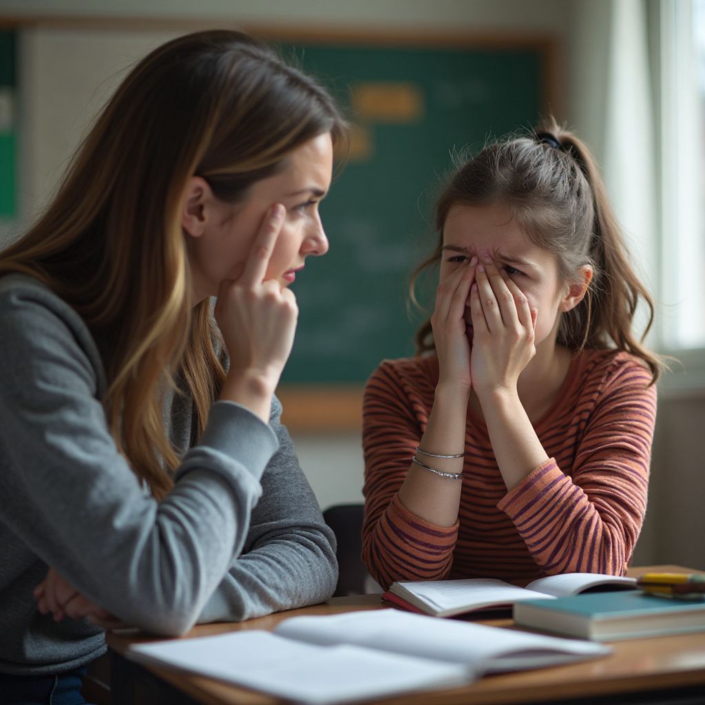 Голос её пронзил тишину, а глаза наполнились слезами, которые уже не скрыть. В этот момент вошли двое одноклассников, Александр и Мария, их лица выражали искреннюю обеспокоенность.
