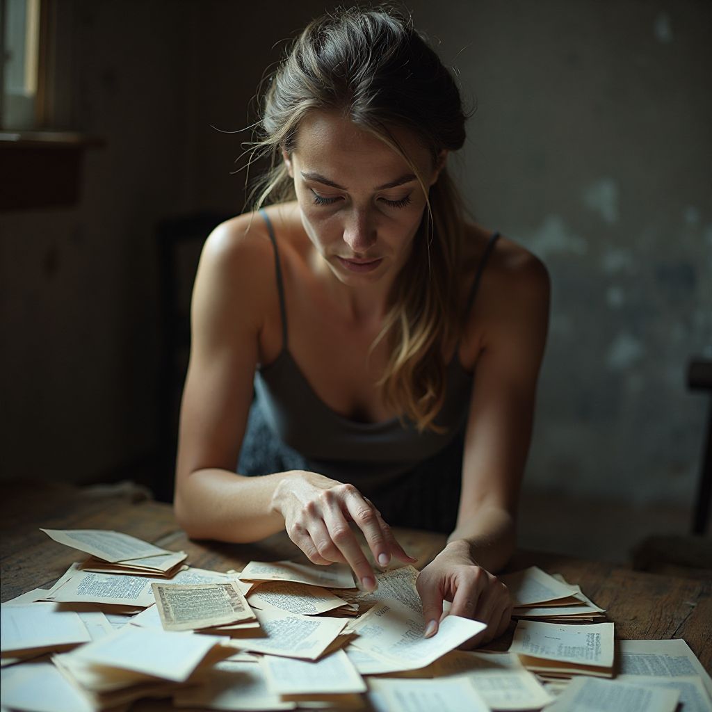 Женщина поднялась, сердце бешено колотилось, а в голове метались мысли, словно тучи перед грозой. На камнях под её ногами лежали старые, пожелтевшие письма, сложенные аккуратными стопками. Свет весеннего утра подчеркнул каждое слово, нарисовав перед ней эти нити чужих судеб. Трепет и опасение переполняли её — кто мог оставить здесь это послание, почему судьбы, написанные там, оказались сложены так близко к месту её падения? Она осторожно взяла первое письмо, внутренние рыдания смешались с желанием понять, что скрывается за этими строчками.
