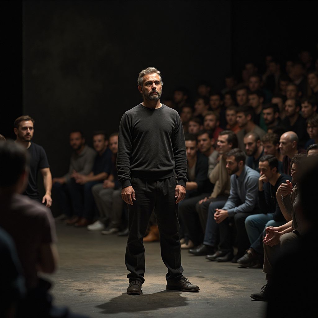 Темнота постепенно отступила, и свет вновь осветил сцену — актёр стоял с тяжёлым, но решительным взглядом, готовый раскрыть правду, которую долго скрывал. В его глазах читалась вся глубина переживаний, как будто каждый зритель почувствовал, что сейчас станет свидетелем откровения, способного сломать стереотипы и потрясти устоявшийся порядок.