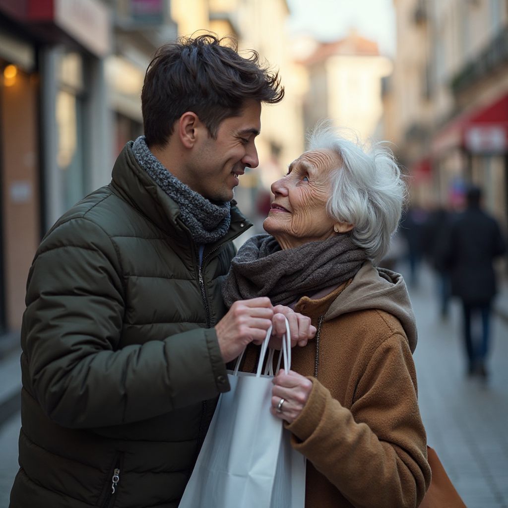 Это вызвало шёпот и косые взгляды прохожих. Женщина опустила глаза, а парень почувствовал, как сердце сжимается от стыда за общество. Внезапно женщина остановилась, глядя в небо, её глаза наполнились слезами, которые медленно стекали по морщинистым щекам. Легкий дождь начал тихо капать, смешиваясь с её слезами.
