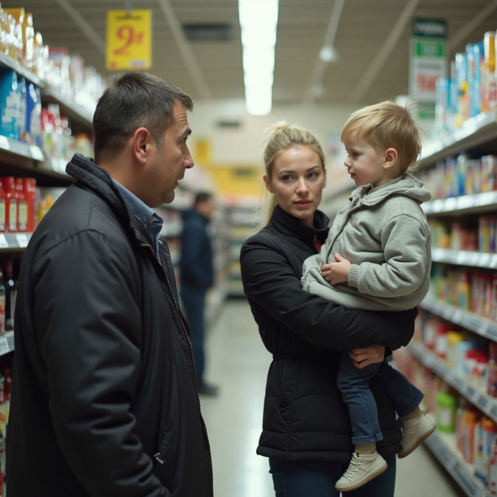 Секунды превратились в вечность. Мужчина медленно обернулся в сторону шороха. В зале магазина воцарилась гнетущая тишина, разрываемая лишь разгоравшимся шёпотом тревоги. Сердце его билось так громко, что казалось, будто слышат все вокруг, а ладони покрылись холодным потом. Люди, кто только что удивлялся, теперь с опаской вглядывались в пустое пространство у стенда, где ещё недавно были женщина с ребёнком.