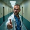 Посреди этой сцены стоял он — мужчина средних лет, худой и высокий, с бледным лицом и глубокими морщинами, как отметинами бесконечных невзгод. Его глаза, тёмные и пустые, были устремлены вдаль, избегая взгляда окружающих. Тёмное пальто, давно потерявшее прежний блеск, висело на нем безжизненно, напоминая о тяжелой доле простого рабочего, едва сводящего концы с концами. Его руки дрожали, едва сжимая черную шапку, а осанка была согнута под грузом воспоминаний и непрошеной вины. Он пришёл сюда не ради почестей, а чтобы проститься с сыном, чей уход оставил в душе зияющую пустоту.