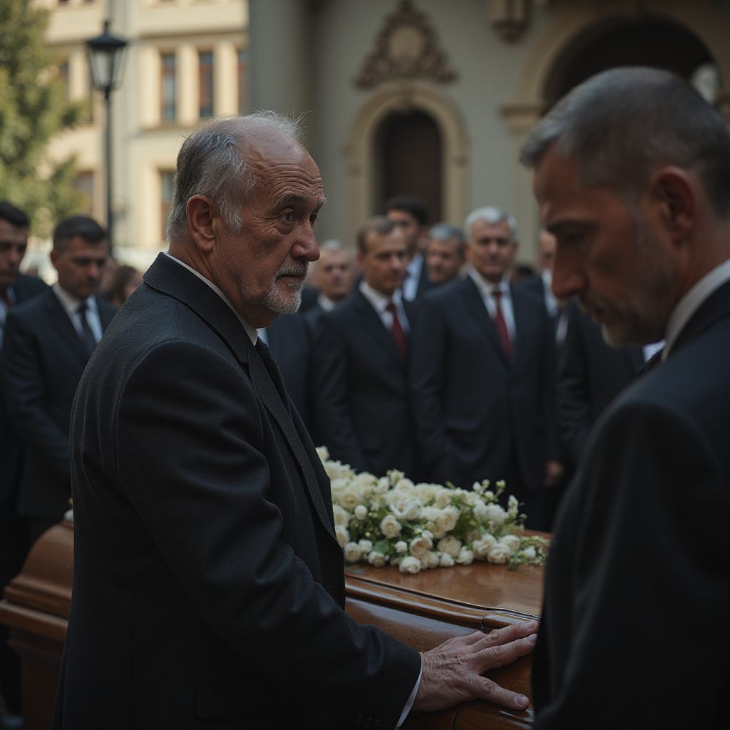 Он медленно повернулся к гробу, и на мгновение мир вокруг, казалось, застыл. Все взгляды устремились на него — это был момент истины, долгожданной, но страшной. Его голос прорвал тишину, дрожа и ломаясь от эмоций: «Прости…» — он произнёс одно короткое слово, наполненное болью и сожалением.