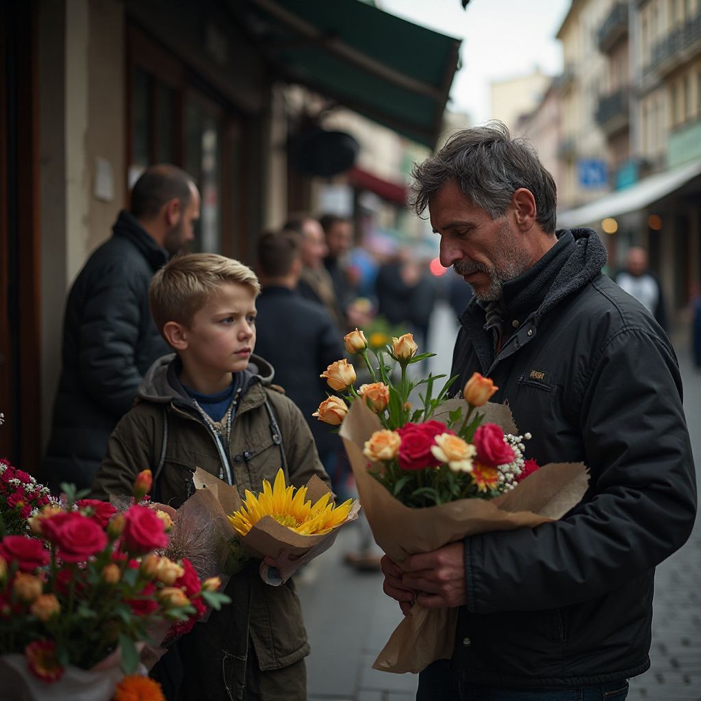 Он был невысокого роста, худощав, с глазами цвета осеннего неба – глубокими и немного грустными. Его непритязательная одежда – старый, местами залатанный свитер и слишком обветшалые брюки – строго контрастировали с яркими букетами, которыми он пытался привлечь внимание редких прохожих. Его маленькие руки бережно держали цветы, словно в них заключалась вся его надежда найти хоть каплю добра в этом жестоком мире. Стук сердец сливался с гулом города — он стоял здесь не от праздного любопытства, а потому, что каждую копейку нужно заработать, ведь дома ждал больной отец.
