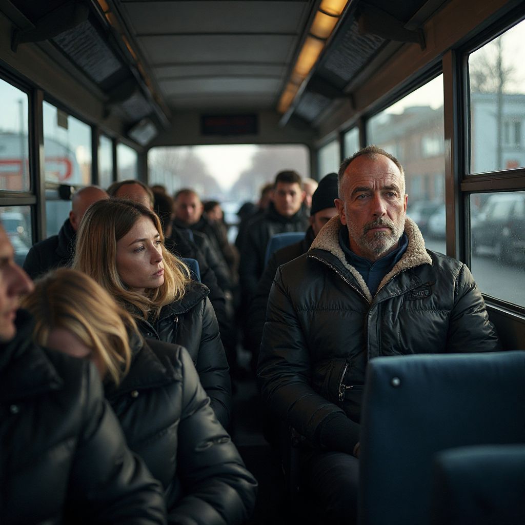 Водитель автобуса сидел за рулём, мужчина средних лет с усталым взглядом и едва заметными морщинами вокруг глаз. Его высокая худощавая фигура была укутана в потрёпанную куртку, а волосы, растрёпанные ветром, загораживали лицо. Люди в салоне — преимущественно усталые и замерзшие, — погружены в свои мысли, выглядели измученными городскими заботами. Среди пассажиров выделялась молодая женщина — она была одета скромно, но аккуратно, со слегка растрепанными светлыми волосами и глазами, в которых пряталась тревога. Она сжимала дверную ручку сиденья и смотрела в окно, словно ожидая чего-то.