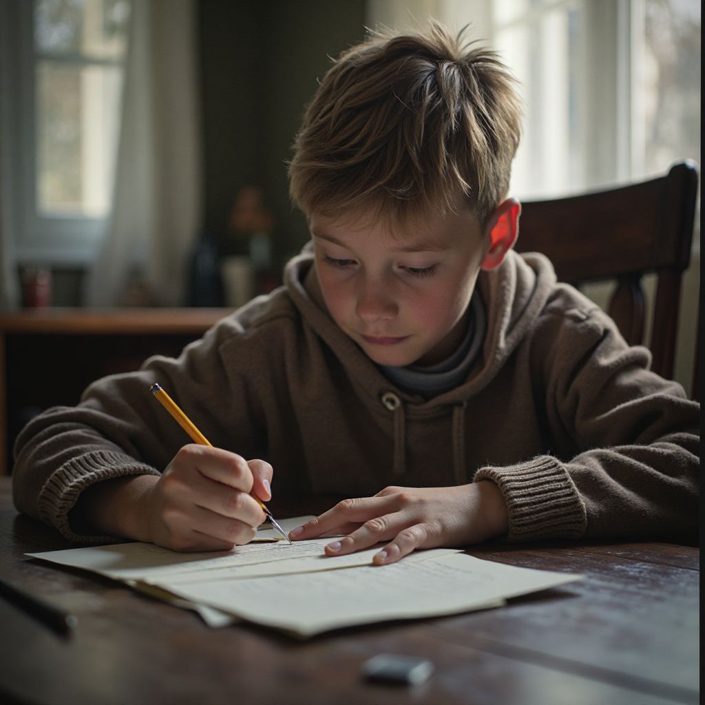Осенний вечер опускался на старый район города, покрытый густым туманом и лёгкой прохладой, которая пронизывала до костей. С улицы доносился шум редких машин и прерывистое эхо шагов, отражавшихся от кирпичных стен ветхих домов. В воздухе витал запах мокрой листвы и старой бумаги, которая сгибалась и шуршала в руках мальчика, сидевшего у окна в небольшой съёмной комнате. Золотистый свет настольной лампы бросал длинные тени на стены, а улица медленно затихала под покровом вечерних сумерек.