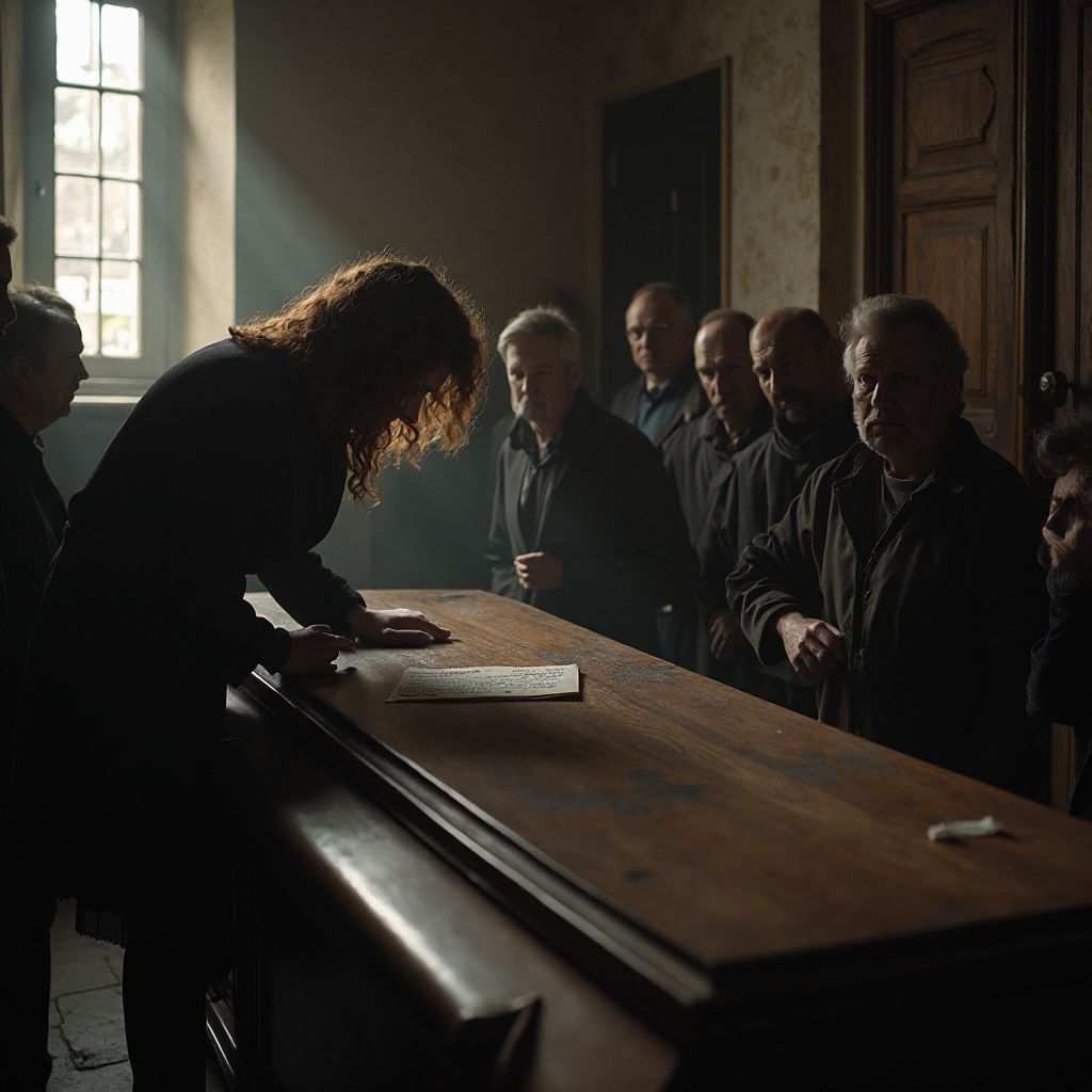 Сьюзен стоит у гроба, держа в руках дрожащую записку. Воздух в похоронном зале кажется плотным, почти осязаемым, и шепоты гостей отступают на задний план. Её пальцы тяжело разглаживают листок бумаги, а сердце колотится так громко, что она слышит собственное дыхание — сбивают ритм стука его сердца, словно угрожая разорвать её на части. В зале повисло напряжение, и все взгляды медленно устремляются на неё. Сьюзен слышит, как старик из задней части комнаты пробормотал: «Не можем поверить, что всё было именно так». Её лицо бледнеет; голос дрожит, начинает читать: