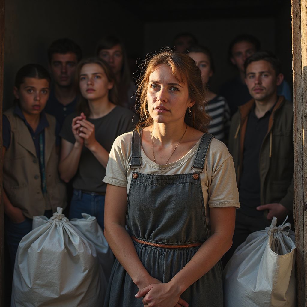 Из-за угла вышел один из волонтёров, мужчина средних лет в простой одежде и с усталым взглядом. «Вы здесь впервые?» — спросил он нежно, но усмехнулся при виде её пустых рук. «Понимаю… бывает тяжело. Следуйте за мной, вам дадут еду и место на ночь». Разговор был простым и доброжелательным, но тон волонтёра словно напоминал — здесь ценятся только те, кто что-то приносит, кто-то важен. Она кивнула и потащилась за ним.