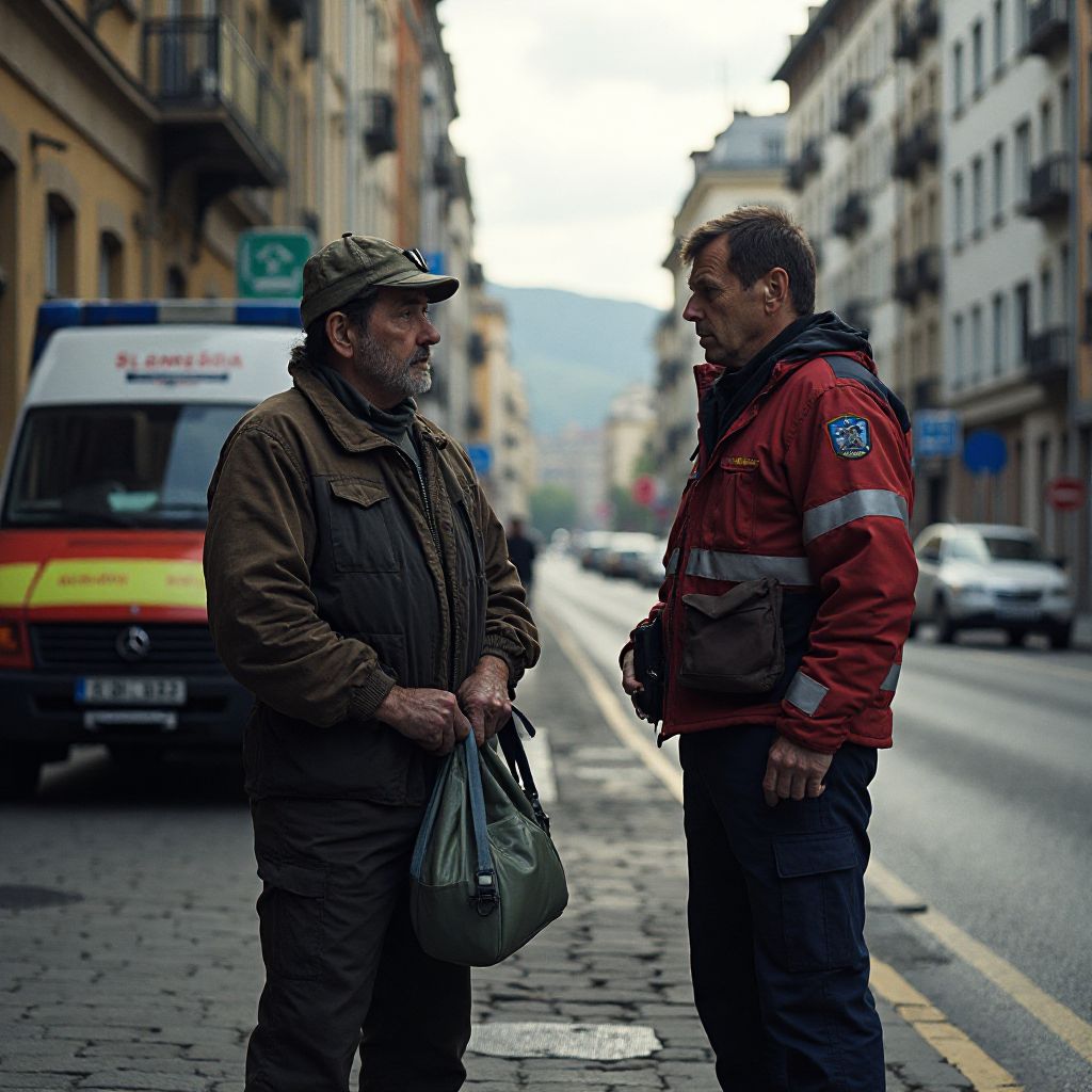 Мужчина вдруг поднялся, но неловко покачнулся, и Александр подхватил его под руку. В этот момент что-то изменилась — взгляд бездомного стал ясным и глубоким, словно он хранил страшную тайну. Александр почувствовал, как внутри пробудилась тревога, сердце забилось сильнее, а пальцы сжали руку, которую держал. Вокруг словно затихло, звук сирены медленно стих, уступая место глухой тишине — момент, когда всё может измениться.