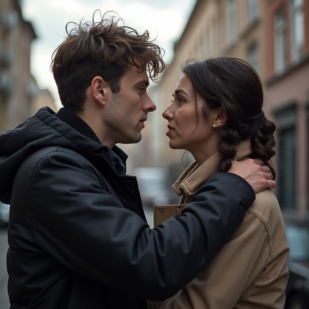 Парень по имени Илья заметил её издали — стройный, с тёмными, слегка взъерошенными волосами и пронзительными зелёными глазами, он выделялся среди шумной толпы. Его джинсы и куртка казались слегка потертыми, но аккуратно подобранными, что мастерски скрывало непростой социальный статус: Илья работал разнорабочим на строительной площадке и мечтал выбраться из постоянной борьбы за выживание. Его острые черты лица выдавали не столько молодость, сколько прожитые испытания. Осанка — ровная, несмотря на усталость, а в глазах — смесь решимости и усталой доброты. Он подошёл ближе, внимательно наблюдая за напряжённой женщиной.