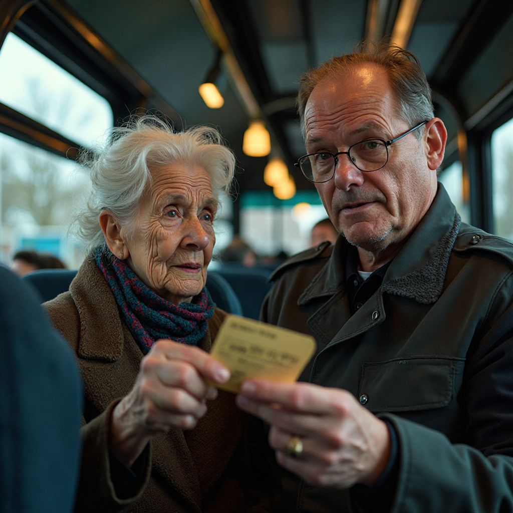 Вдруг у дверей появилась старушка — невысокая, чуть поскрипывающая при ходьбе, с тростью в руке и изношенным пальто, запах которого навевал воспоминания о давно минувших временах. Её глаза, усталые и глубокие, словно отражали целую жизнь, смотрели прямо на водителя. Она недолго колебалась, медленно протянула ему билет, который выглядел почти стёртым, будто переживший века. Водитель взял билет, и его взгляд на мгновение застыл. Он не мог поверить своим глазам.