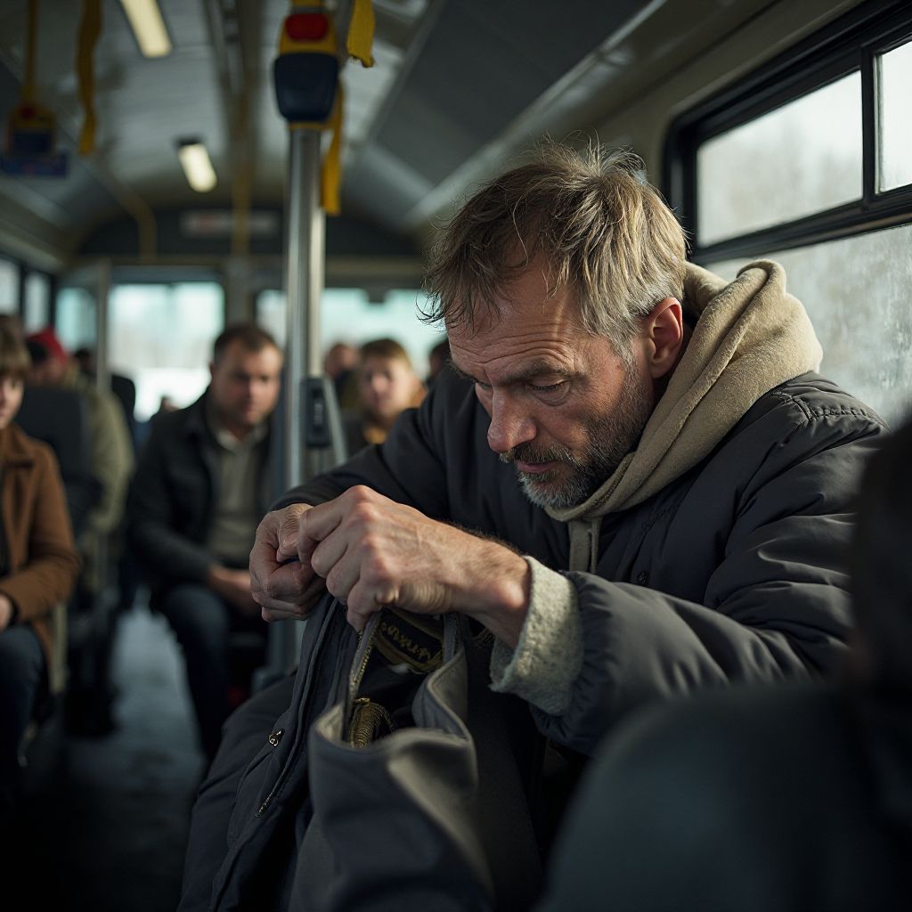 В центре внимания оказался мужчина средних лет — неказистый, в поношенной куртке и выбелившейся шапке. Его глаза были серыми, усталыми, с тонкой сетью морщинок в уголках, как линии судьбы, что выписала жизнь с суровой рукой. Он держал в руках плотный, немного помятый бумажный пакет, будто тайну, слишком важную и слишком опасную. Его походка скромна, глаза опущены к полу автобуса, и голос почти неразборчивый, когда он переспросил кондуктора, сколько остановок ему осталось. Его одежда явно контрастировала с несколькими богато одетыми пассажирами, которые сидели в первых рядах — дорогие пальто, сверкающие грубые часы, наглые взгляды, что скользили с презрением.