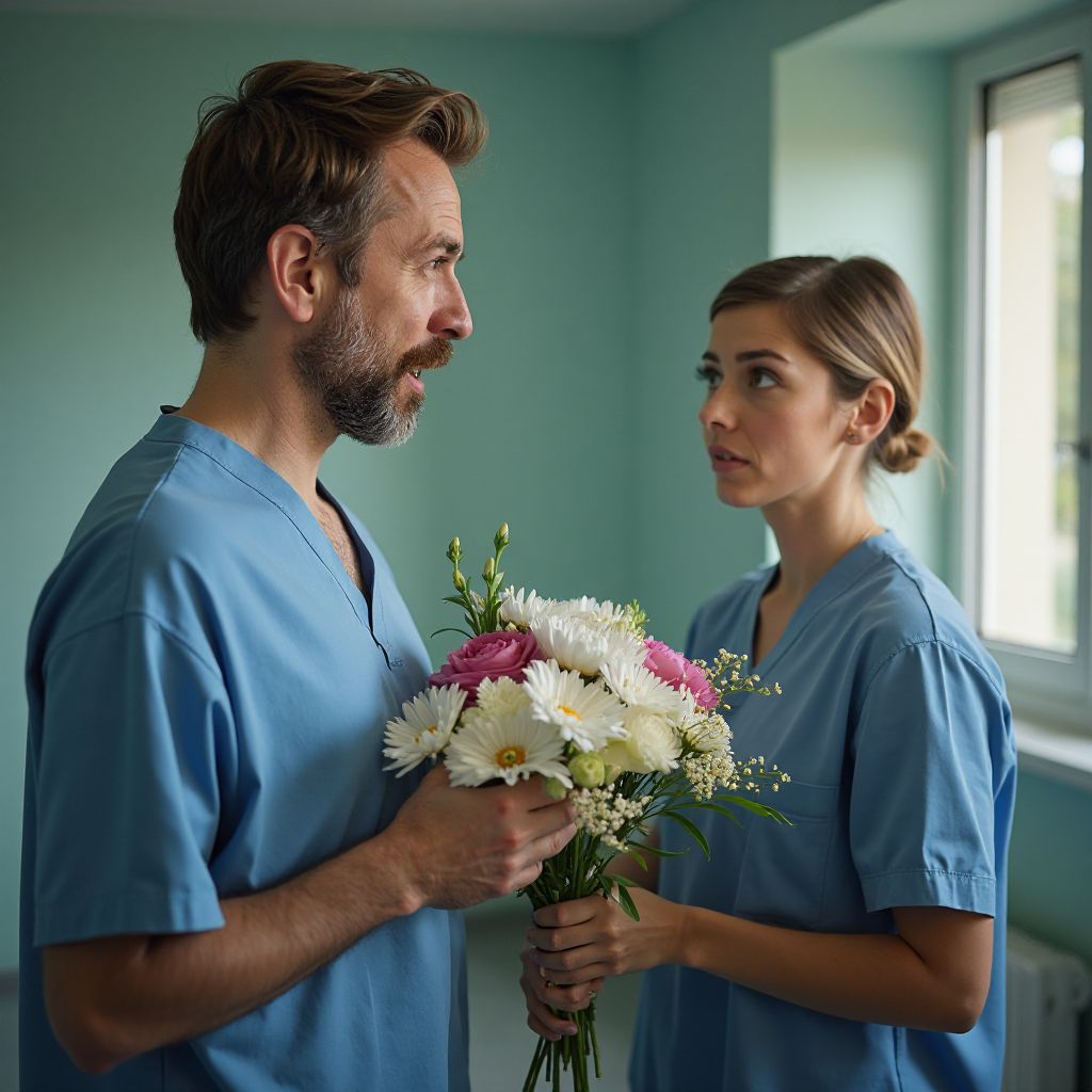 Воздух стал тяжелым, будто сама комната предвкушала неизбежное. Мужчина выпрямился, глубоко вздохнул и топнул ногой, поднимая букет чуть выше. Его губы начали шевелиться… Однако именно в этот момент дверь роддома резко захлопнулась, и всё в комнате замерло, ожидая дальнейшего раскрытия тайны… Переходите на сайт, чтобы узнать, что случилось дальше — невозможно забыть!