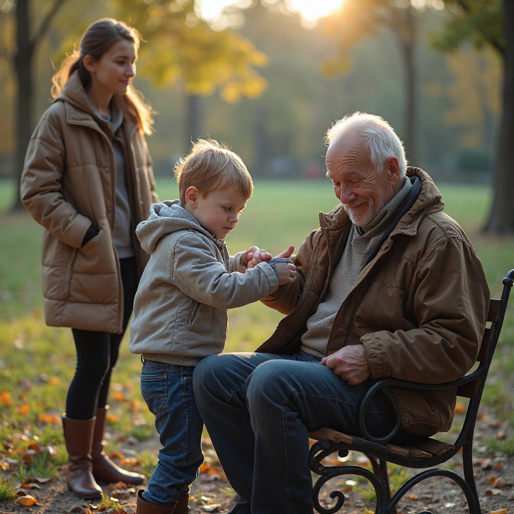 Мысли девушки кружились вокруг того, как меняется жизнь, и какой груз никто из прохожих даже не замечает. Взгляд её упал на старика, пригнувшегося к внуку, пытающемуся поймать бабочку. Его морщинистое лицо и руки, дрожащие от возраста, рассказывали историю тяжёлой судьбы. Внучок, весь в ярком шарфе и с искрящимися глазами, уверенно повторял слова старика, не замечая тяжести, лежащей на плечах старика.