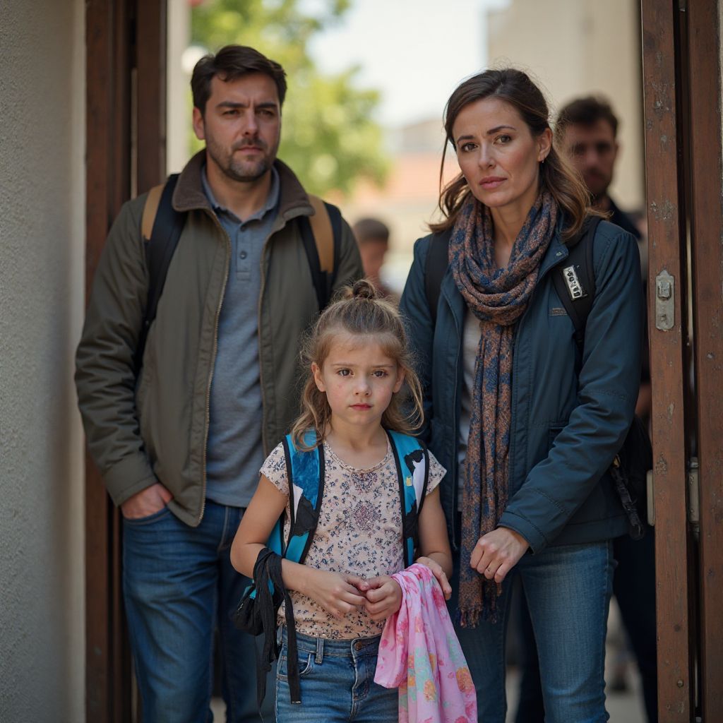 У ворот стояла женщина средних лет — Елена, почти незаметная в сером плаще и потертых ботинках. Её лицо было усталым и бледным, глаза — глубокими и тревожными, словно несли на себе тяжесть прожитых бед. Волосы, собранные в небрежный пучок, слегка выбивались из-под капюшона, а руки нервно сжимали кожаную сумку. Елена была матерью, которая пришла забрать свою дочь из школы — не просто зашедшая за своим ребёнком, а женщина, которая несла с собой горечь и надежду. Её социальный статус был заметен в мелочах: изношенные вещи, усталый взгляд, но при этом в осанке читалась непреклонность.