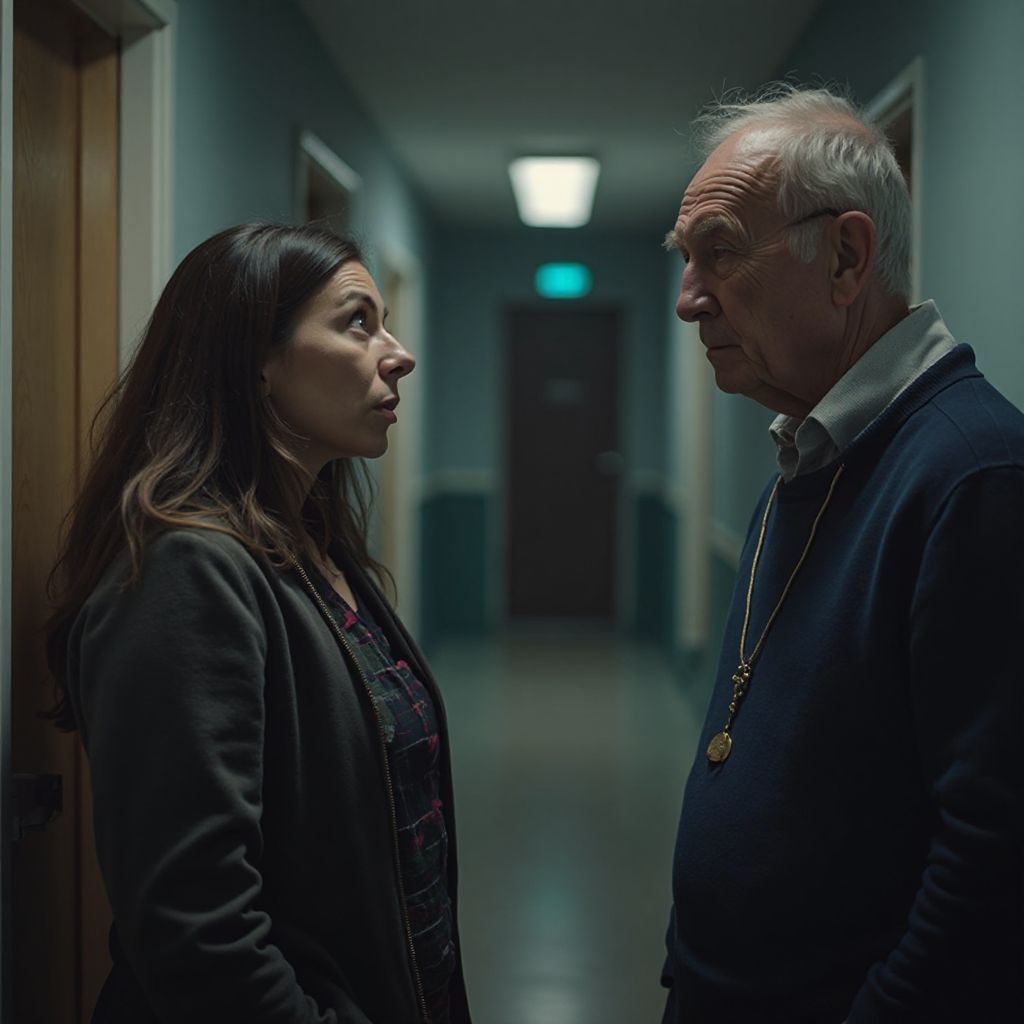 «Ты же знаешь, кто я,» — тихо произнёс старик, и голос его звучал так, будто исходил не из настоящего, а из чьих-то далёких воспоминаний. Она медленно ответила, пытаясь скрыть дрожь в голосе: «Я не понимаю… Что вы имеете в виду?». «Мы встретились много лет назад, и теперь время пришло», — продолжал он, не отрывая взгляда. Вокруг них никто не обращал внимания, но Машу одолевало странное ощущение — будто вокруг сжимался воздух, напряжённый и тяжёлый. В этот момент за дверью раздался звонок, и коридор как будто замер в предвкушении.