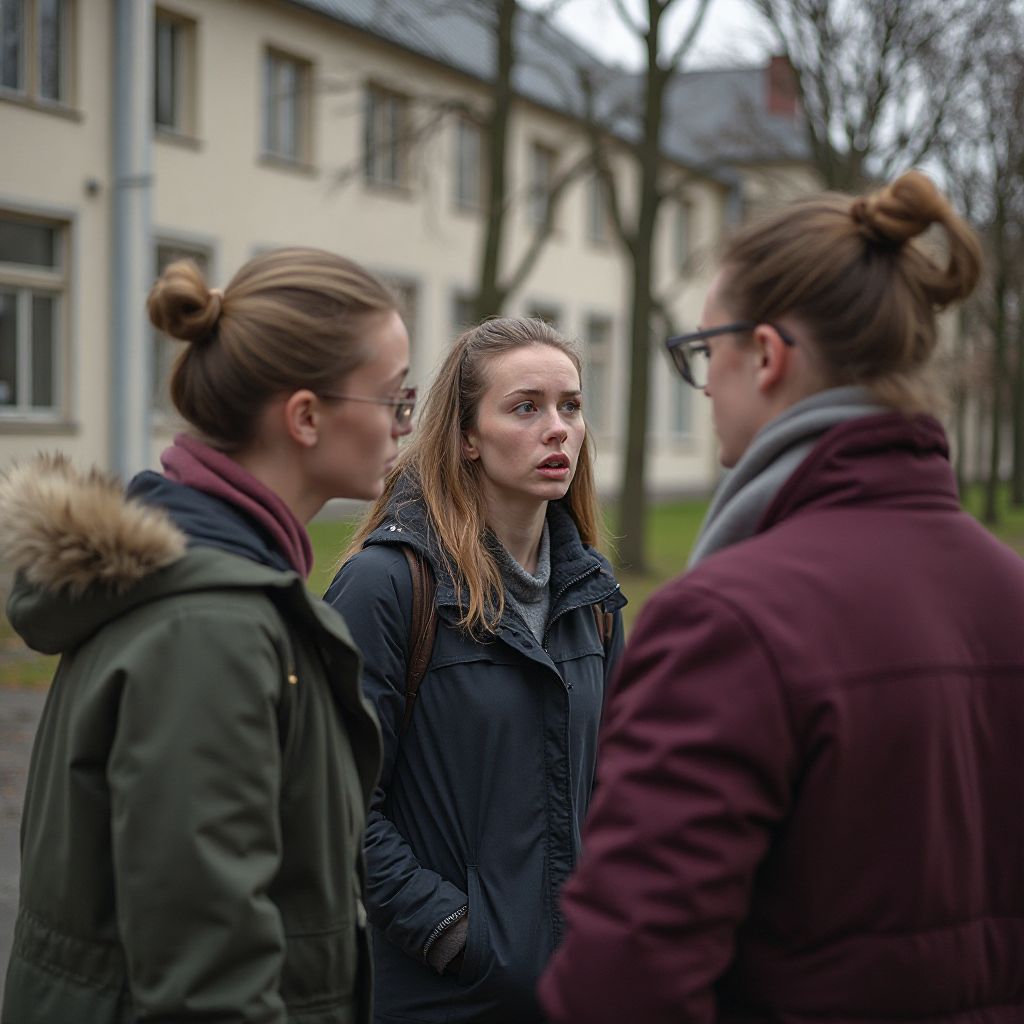 В углу школьного двора группа учителей собралась в тесный круг, тихо переговариваясь. Их взгляды были напряженными и осторожными, словно они боялись, что их услышат. Были слышны лишь фрагменты слов: «…проблемы с семьей…», «…нужно решить…», «…социальный статус…» — всё это звучало холодно и безжалостно. Лена заметила, как одна из учительниц сжимает руки в нервном порыве, а другой мужчина бросил на нее короткий взгляд, полный осуждения.