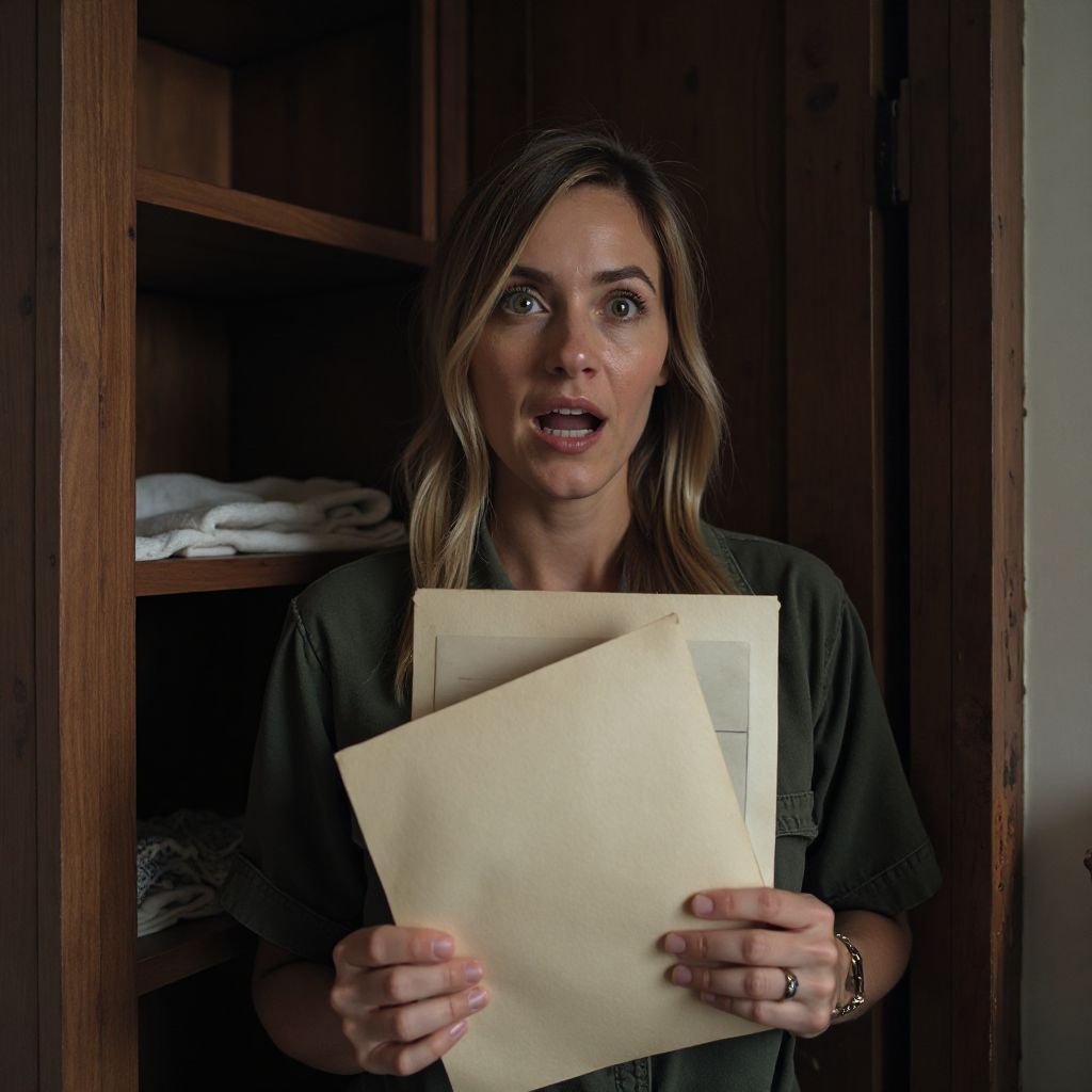 Когда Марина открыла один из старых шкафов в уборочной комнате, её взгляд упал на пожёлтевший конверт, засунутый за стопку ветхих бумаг. «Что это?» — прошептала она сама себе, осторожно доставая письмо. «Наверное, никто давно не заглядывал сюда». В этот момент раздался скрип пола, словно кто-то невидимый наблюдал за ней. Сердце забилось быстрее, дыхание стало прерывистым. «Нужно посмотреть, что внутри», — решила она, разворачивая запыленный лист бумаги.