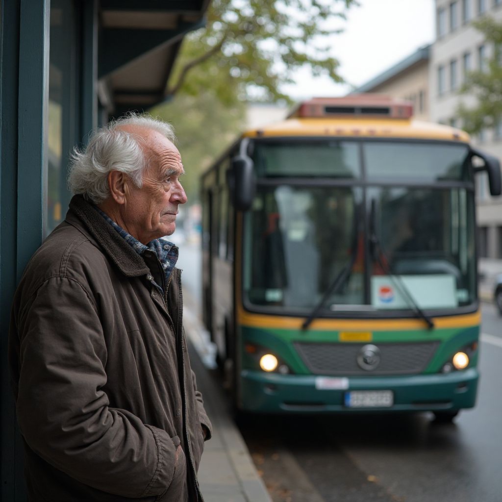 «Вот это поворот», — говорит второй подросток, переходя на шумный разговор с остальными. «Он всё ждёт, а автобус давно уехал. Настоящая жалость». Разговор усиливается, в уголках губ появляется злобная улыбка. От лиц слышны сквозняки равнодушия и снисхождения, словно общество отделило старика в отдельную категорию, совсем не ожидая его оправданий.