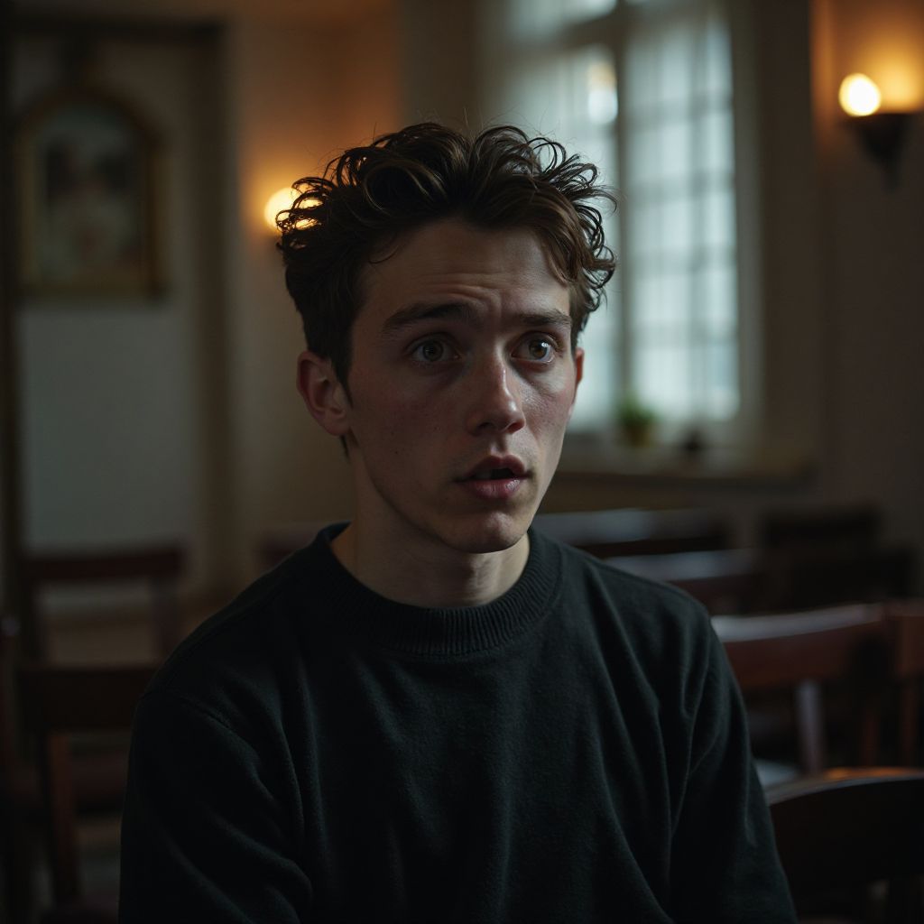 В центре всего этого молчаливого собрания стоял он — молодой парень с усталым взглядом, ростом чуть выше среднего, глаза цвета пасмурного неба, волосы тусклые и слегка растрёпанные. Его одежда была простая, изношенный свитер и потертые джинсы едва скрывали признаки скромного достатка. Осанка его была сгорбленной, а руки дрожали от внутреннего напряжения. Он не был частью богатой семьи, и каждое его движение выдавало человека, привыкшего к борьбе с обстоятельствами. Но сегодня он пришёл сюда не просто попрощаться — в его голове зрело что-то тревожное, и он ждал момента, когда сможет наконец раскрыть правду.