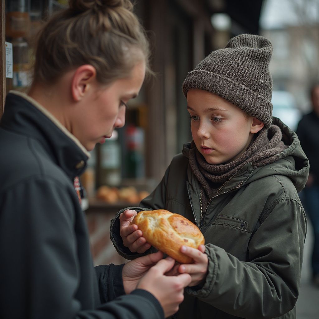 «Посмотри на него, — тихо проговорил Василий себе, — отдают последнюю еду кому-то, кому и так трудно». Его голос был почти шёпотом, но в нём звучала горечь и недоумение. «Зачем он так делает? Кто этот мальчик? Почему он не боится голода?» — вопросы медленно крутились в голове. Как вдруг у мальчика в глазах мелькнула тень тревоги, и он быстро поспешил прочь. «Постой, — крикнул Василий, пытаясь догнать, — подожди!» Но мальчик уже исчез в море людской суеты.