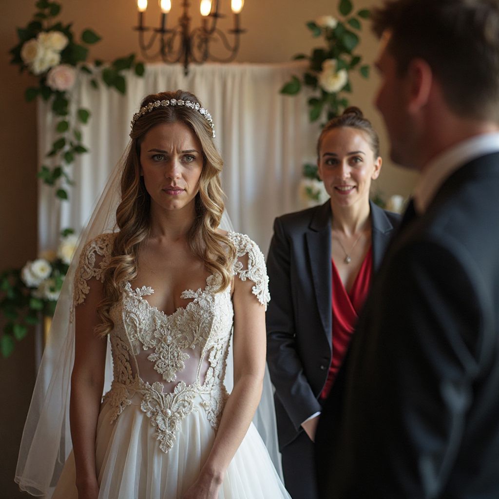 В центре этой роскоши стояла Алина — хрупкая девушка с тонкими чертами лица и большими грустными глазами цвета дождливого неба. Её белое платье из дорогого шёлка, украшенное кружевом, контрастировало с плечами, слегка согнутыми под тяжестью переживаний. Волосы, подобранные в небрежную укладку, казались слегка растрёпанными — неестественно для дня её свадьбы. Её кожа была бледна, губы чуть поджаты, словно пытаясь сдержать бурю эмоций. Каждый взгляд на роскошный зал и улыбающихся гостей порождал в ней внутренний конфликт, словно она была далеко от этого праздника и самого себя.