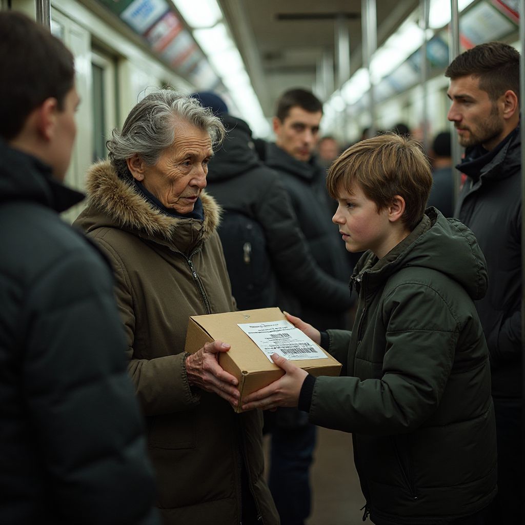 «Что в этом пакете?» — пробормотал он себе под нос. Вагон внезапно наполнился шёпотом пассажиров, которые переглядывались и тихо обсуждали произошедшее. «Ты где этот пакет взял?» — спросил один из мужчин в рабочей одежде, поднимая бровь. «Старушка просто подошла и дала», — ответил мальчик, стараясь выглядеть невозмутимо. «Пакеты в метро — опасно, может быть что угодно», — прорычал другой, оглядываясь на всех с подозрением. Мальчик чувствовал, как взгляды окружающих стройнают на нем — от сочувствия до страха и отчуждения.