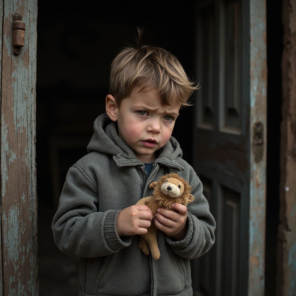 Малыш, казавшийся всего семилетним, стоял у массивных дверей приюта, сжимая в руках старую игрушку — деревянного медвежонка, покрытого трещинами и пятнами времени. Его худенькое, покрытое испачканной ветошью пальтишко слишком мало скрывало от пронизывающего холода маленькое тело. Ноги в изношенных ботинках слегка дрожали, а большие глаза смотрели вникуда, отражая смесь одиночества и осторожности. Волосы, спутанные и грязные, едва прикрывали бледный лоб. Несмотря на всю бедность, малыш нес в себе невидимую гордость — словно та старая игрушка была единственным, что связывало его с прошлым, которого никто не должен был знать.