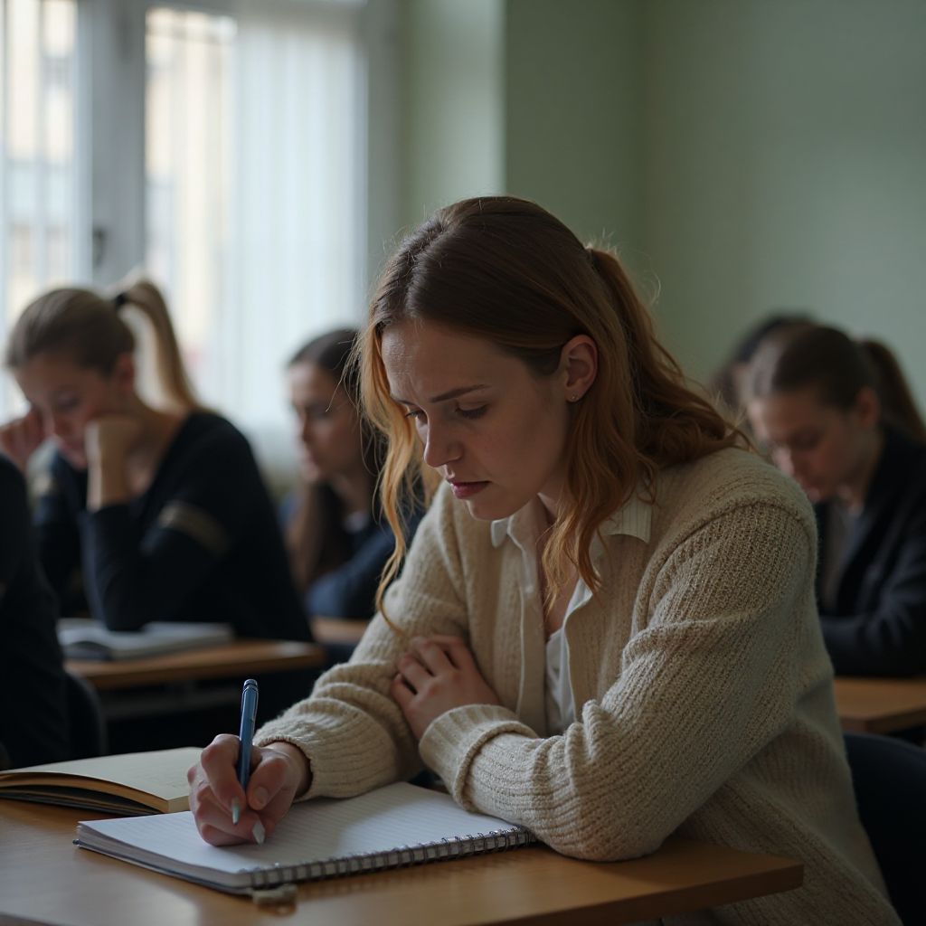 В центре событий оказалась Наталья Ивановна — учительница русского языка и литературы, женщина средних лет с усталыми серыми глазами, обрамлёнными морщинами и тусклыми локонами, спадавшими на плечи в строгой тёмной блузке и юбке. Её фигура была хрупкой, словно тонкий тростник на ветру, осанка — слегка согнутая, а голос — тихий и вкрадчивый. Несмотря на видимую строгость, в ней чувствовалась внутренняя ранимость и груз пережитых лет. Наталья долго стояла у доски, держа в руках распечатки стихов, которые сдавала один за другим мальчишкам и девчонкам, сдаваясь мыслям и воспоминаниям.