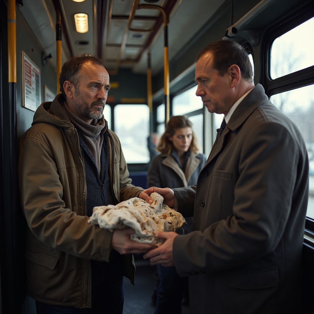 Сердца остановились на мгновение, когда мужчина передал кондуктору загадочный свёрток. Все взгляды моментально устремились к нему — тихий голос, наполненный усталостью и страхом, прорезал мрак густого салона автобуса. Кондуктор, пожилая женщина с суровым взглядом и морщинами, говорила с едва сдерживаемой тревогой: «Что там, скажи мне, в этом свёртке?» Мужчина тихо ответил: «Это история, которую должны услышать все. Но не здесь.»