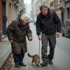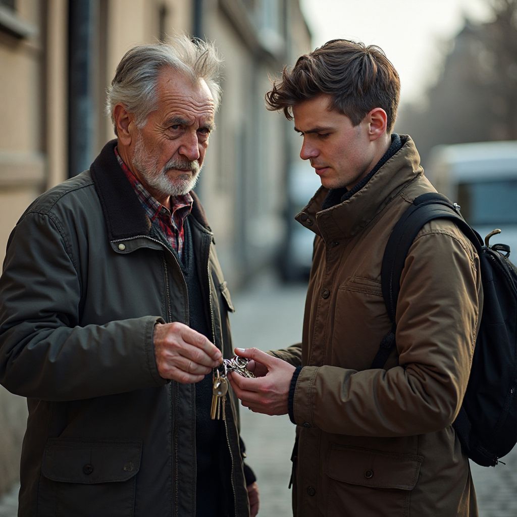 Рядом группа прохожих остановилась, их взгляды переключились на странную сцену. «Кто этот старик? Почему он отдает ключи бродяге?» — шептали женщины, озираясь с подозрением.