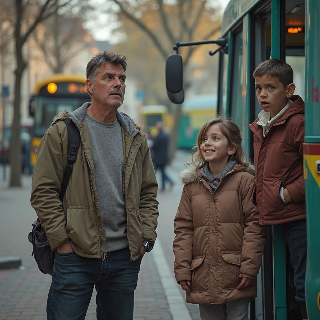 Андрей, водитель троллейбуса, стоял у остановки, пристально поглядывая на пустынную детскую площадку. Его высокий рост и широкие плечи выделялись на фоне хмурых зданий старого района. Глубокие морщины на лице и седеющие виски выдавали человека, привыкшего к тяжелой работе и постоянной усталости. На нем была простая потёртая куртка и изношенные ботинки — одежда небогатого человека, который всю жизнь старался свести концы с концами. Его жесткие руки выглядели сильными, но чувствовалось — за ними скрывалась усталость и переживания, которые он не мог позволить себе выдать в глаза прохожих.