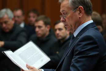 В зале суда, пропитанном гнетущей тишиной, тусклый свет хлынул из высоких окон, отбрасывая длинные тени