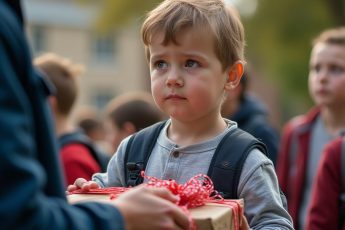 Школьный двор залит мягким светом утреннего солнца, проливающегося сквозь ветви облетевших деревьев.
