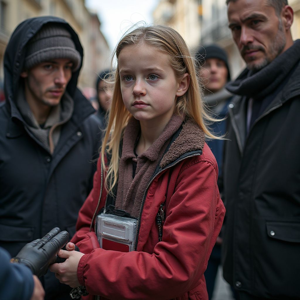 Толпа вокруг начала шептаться громче. «Зачем ей это надо? Она же просто ребёнок.» — сказал один прохожий, пожимая плечами. «Не личное дело девчонки,» — добавил другой, насмешливо улыбаясь. «Пусть убирается отсюда,» — прокричал охранник. Её пальцы сжались в кулак сильнее, а глаза наполнились слёзами. Внутренне она боролась между страхом быть отвергнутой и желанием помочь.