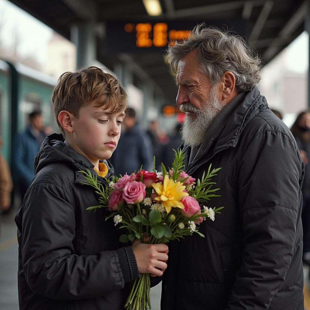 Напротив, к нему медленно приблизился мальчик лет десяти. Небольшого роста, с глазами цвета неба после дождя, он держал в руках скромный букет полевых цветов — неприметный, но излучающий тепло. Одет был мальчик в старую куртку с заметными латками, ботинки разнокалиберные, но аккуратные. Каждый его шаг сопровождался тихим шелестом газеты, сложенной под мышкой, в которой он только что прочитал о добрых поступках. В этот вечер он пришёл на вокзал не просто так — в его сердце жила забота о тех, кого забыли.