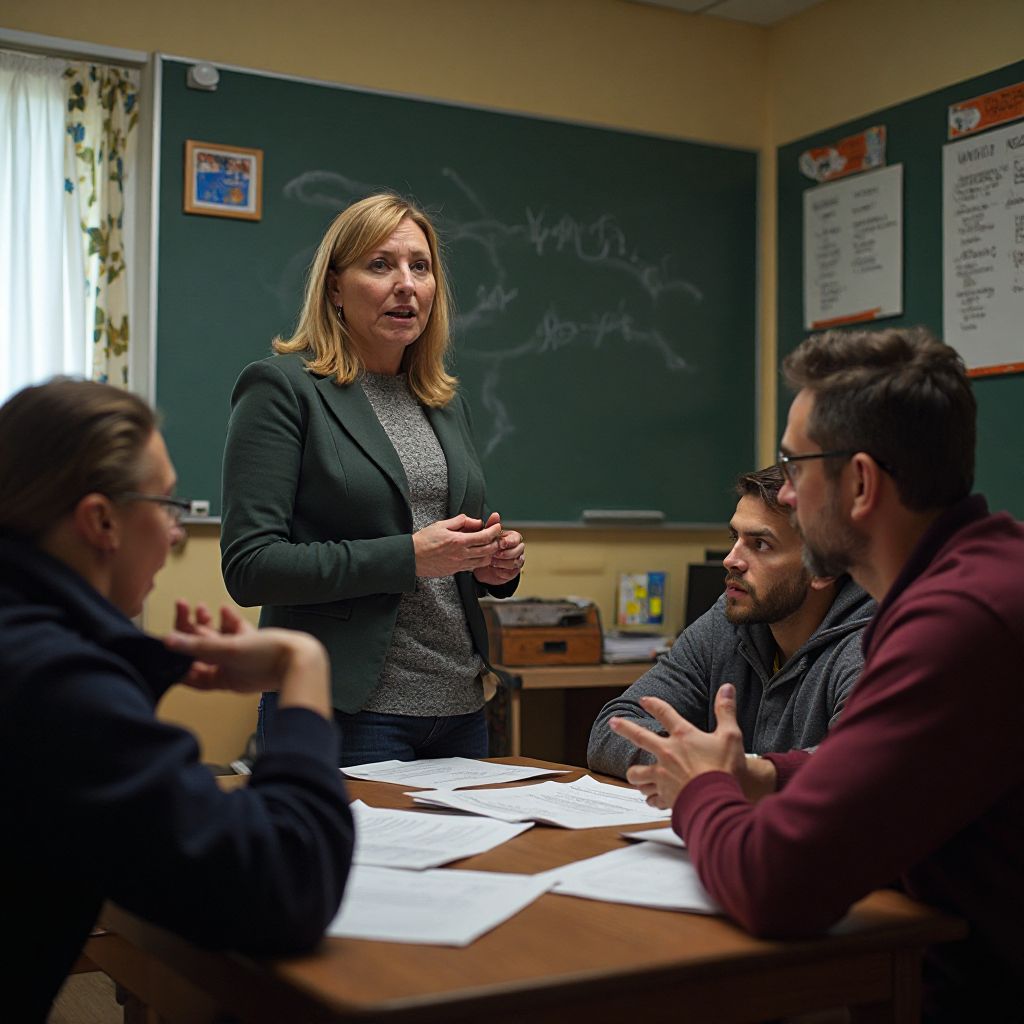 В голове роились мысли: «Что скажут родители? Почему вдруг такая напряжённость?» Он не мог отделаться от чувства, что эта встреча станет чем-то больше, чем простым обменом словами о детях. Сердце слегка учащало биение, когда он проходил в класс, где уже собралось несколько мам и пап, разбитых по социальным категориям и судьбам — от безмолвной женщины с тёмными кругами под глазами до взъерошенного молодого отца в дорогой куртке.