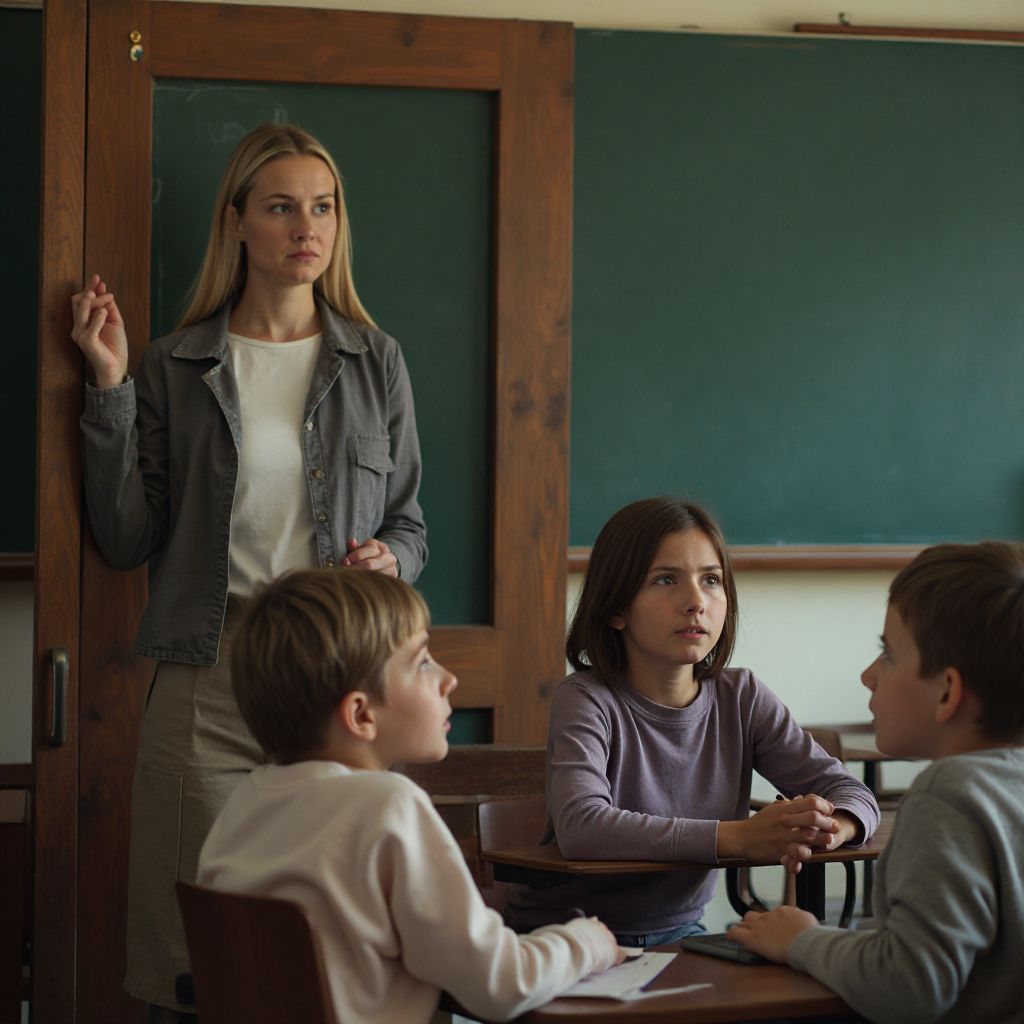 «Марина Ивановна, зачем вы это говорите?» — спросила тихо девочка с тёмными глазами и мерзнущими пальцами, дрожа не только от холода, но и от напряжения в комнате. «Хотите нас напугать? Мы и так живём, как можем!» — прохрипел другой ученик. Шёпоты и смешки наполнили пространство, будто пытаясь заглушить тревогу, которая сжимала горло у каждого. Учительница внимательно смотрела на класс: её лицо оставалось спокойным, но в голосе звучала стальная решимость. «Сегодня я расскажу то, что меня держало в страхе всю жизнь. Но вы должны услышать — это важно». Жар от стыда и злости начал нарастать внутри Лизы, и она почувствовала, как руки её стягивает холод, а сердце бьётся ощутимо сильнее.