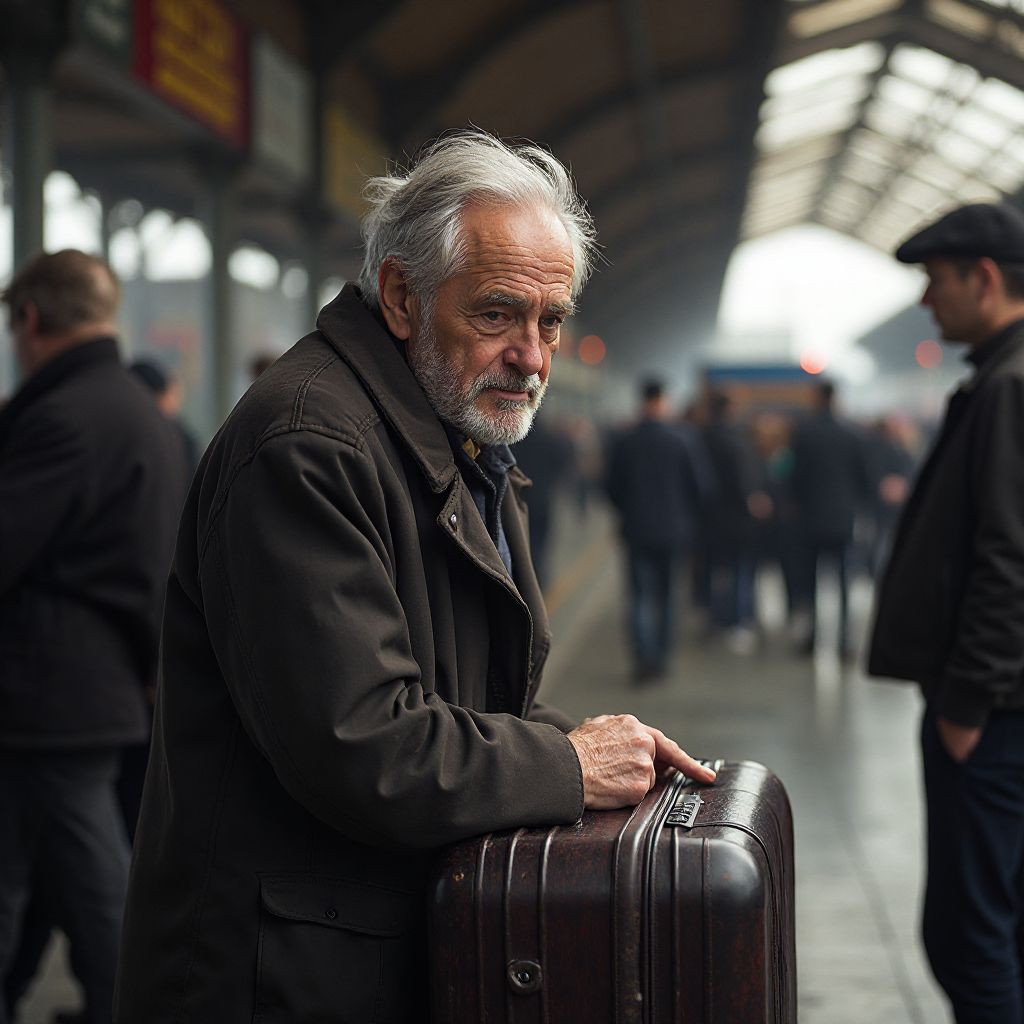 Он вгляделся в тусклое свечение у стены — старик, едва заметный среди теней, медленно приближался к сумке чужого человека. Его хрупкая фигура, согнутая и покрытая тонким пальто, казалась неуместной среди старого вокзала, где господствовали спешка и равнодушие. Глаза синие, прозрачные, казалось, видеть сквозь людей, словно он берег какую-то невидимую истину. Шар и трость, пожухшие перчатки, все выдавало скромный социальный статус — ветеран, заброшенный и забытый, как и многие здесь.