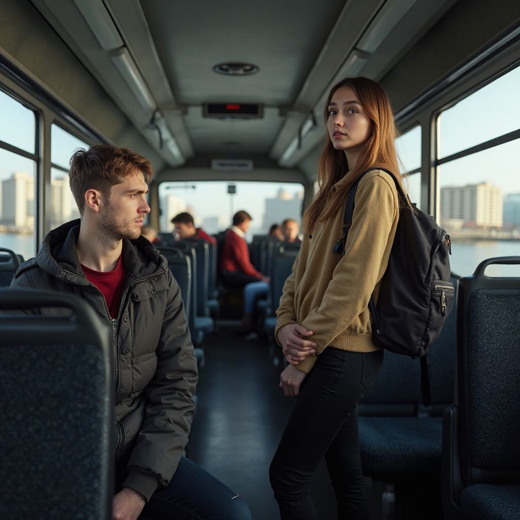Автобус медленно дрожал, когда девушка, стоящая рядом, продолжала писать в своей тетради. Сердце мужчины билось так громко, что казалось, слышит его не только он сам. Все пассажиры повернули головы, будто ожидали что-то важное, и воздух наполнился напряжённым молчанием. Свет фонарей отражался в влажных стеклах, создавая иллюзию миража, которая казалась одновременно звонкой и зыбкой.