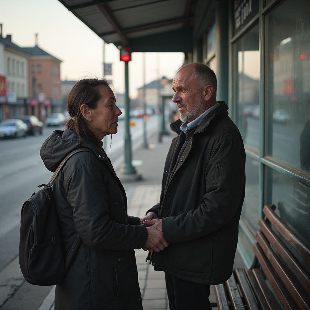 Стоя на мокром асфальте у остановки, мужчина осторожно протёр слёзы женщины своим платком. Взгляд его был полон смеси сожаления и стремления помочь. Женщина, всхлипывая, впервые за долгое время позволила себе немного расслабиться, словно нашла опору среди равнодушия окружающего мира. Прохожие, замедлив шаги, отводили глаза или шептались, чувствуя напряжение момента. Ветер шуршал мокрыми листьями, а гул машин казался далеким и приглушённым — будто вся вселенная замерла, наблюдая за этим неприметным эпизодом человеческого драматизма.