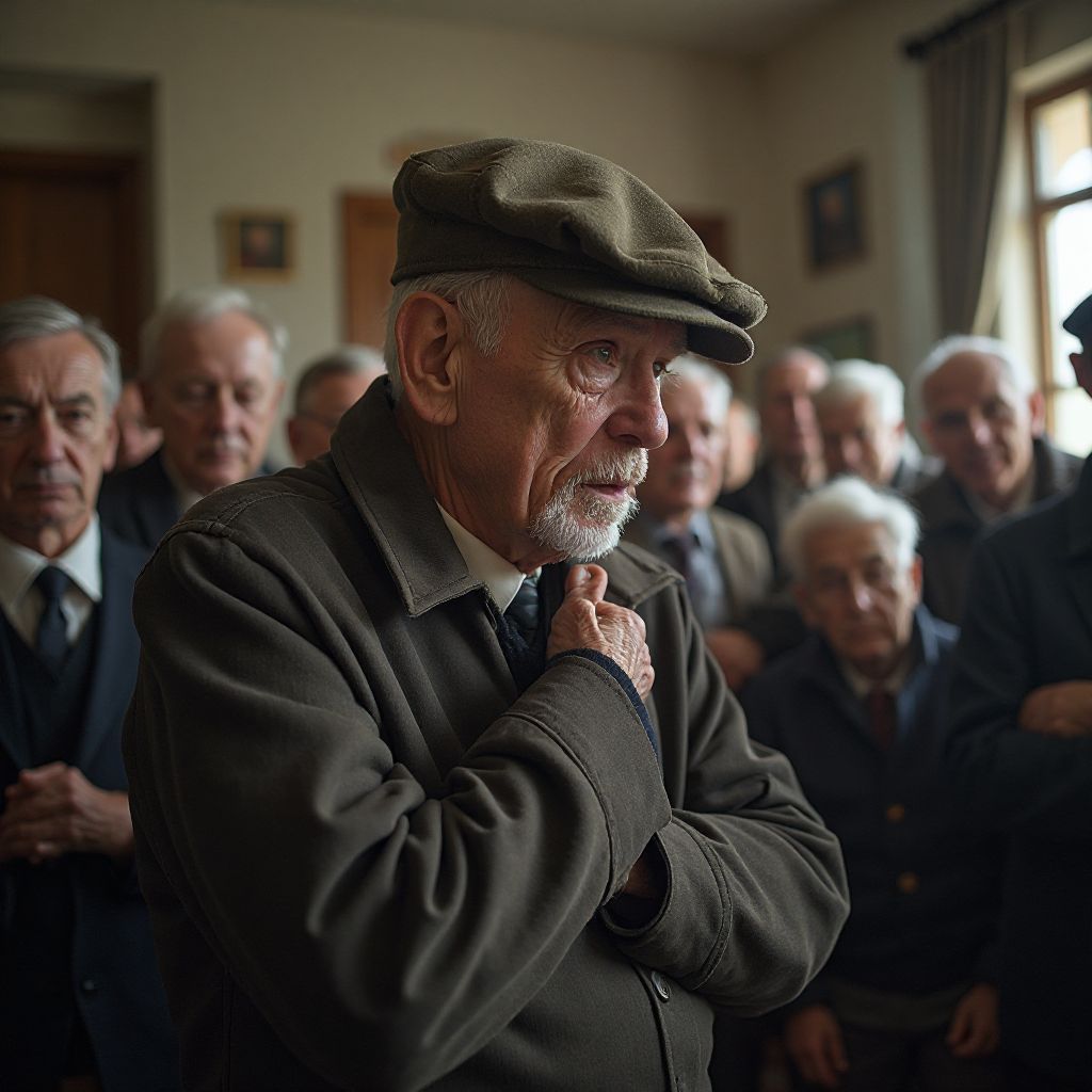 Среди собравшихся выделялся пожилой мужчина с уверенной осанкой — ветеран, с морщинами, вырезанными жизнью и глазами цвета затуманенного неба. Его высокий рост и седые волосы придавали ему аристократичность, но одежда — немного поношенный кашемировый пиджак и скромные замшевые туфли — рассказывали о непростой судьбе. Он не походил на тех, кто пришёл сюда показать успех или богатство. Его взгляд был полон внутренней силы и тени боли, а в руках он крепко сжимал пожелтевший конверт, словно держал в сердце целую жизнь.
