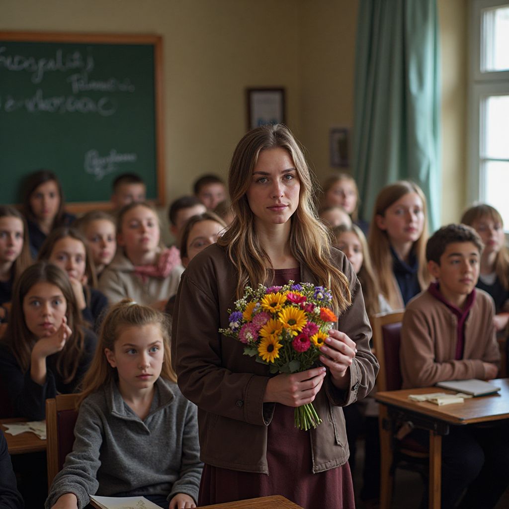 В классе повисла тишина, прерываемая только тихими вздохами и шуршанием одежды. Сердце учителя билось всё быстрее, напряжение росло, словно наваждение. Руки слегка дрожали, когда он аккуратно положил букет на стол, а глаза блестели от сдерживаемых слёз и невыносимой тяжести в душе.