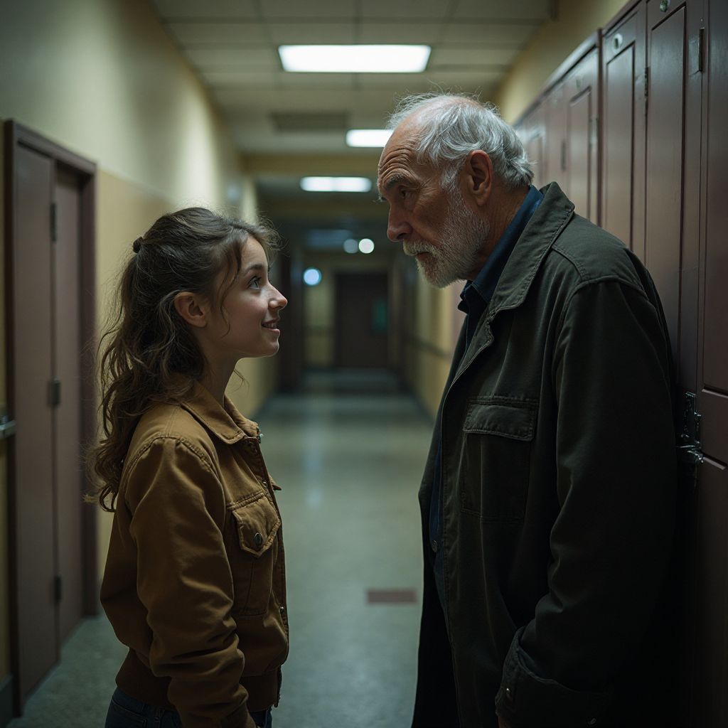 Неожиданно впереди появился он — старик с тонким взглядом, слегка сутулый, со школьным портфелем в руке. Его одежда выглядела устаревшей, словно он пришёл из другого времени: благоразумный пиджак, потёртые брюки и туфли, скрипучие при каждом шаге. Девочка замерла. Он был учителем, которого официально сняли с работы много лет назад и о котором ходили лишь тихие разговоры и догадки. Она ощутила, как в воздухе нависает напряжение — ни ученик, ни учитель не ожидали этой встречи.