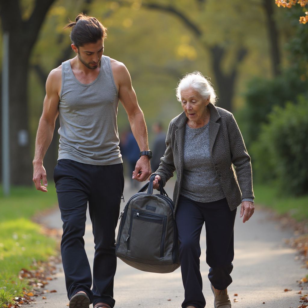 Внезапно внимание Александра привлекла женщина, идущая навстречу у входа в парк. Она несла тяжёлую сумку, каждая её неровная походка выдавала усталость и боль. «Давайте помогу вам», — сказал он, подойдя ближе. Женщина улыбнулась сквозь усталость, и в её глазах мелькнуло удивление — редкое чувство доброты в этом холодном мире. «Спасибо, сынок, не откажусь», — тихо ответила она.
