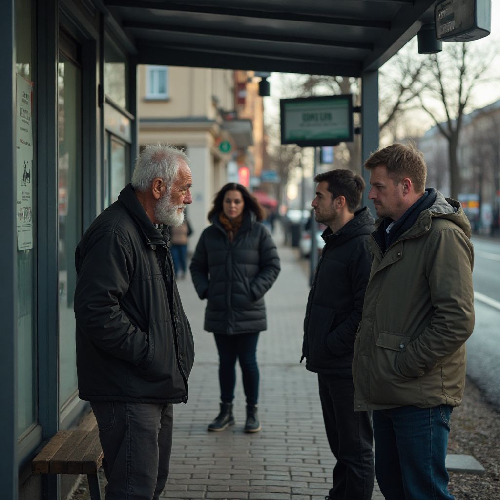 На краю остановки стоял пожилой мужчина, хрупкий и слегка сутулый. Его глаза, серые и усталые, блестели от робкого взгляда окружающего мира. Рост невысокий, одежда — старенькое, но чистое пальто, замененное на несколько размеров больше, словно украденное у давно забытого родича. На ногах — изношенные туфли, где подошвы уже просматривались сквозь тонкую кожу. Вокруг него люди в смешанных возрастах: молодые в ярких куртках, спешащие к своим делам, и такие же старики, но все не могли оторвать взгляд от его явного неприятия.